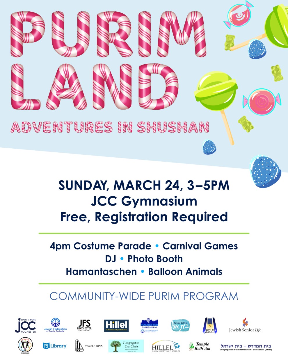 Sponsor: Fed, PJ, JCC, Temple Sinai, Temple Beth El, Temple Brith Kodesh, Chabad, OHC, Temple Emanu-el, Temple Beth Shalom, Hillel School