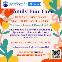Starting at sundown, kids will make a creative everlasting pipe cleaner plant and their own personal bag / bottle of spices to use at Havdalah. we will sing together and read a story. Kosher snacks and drinks will be provided.