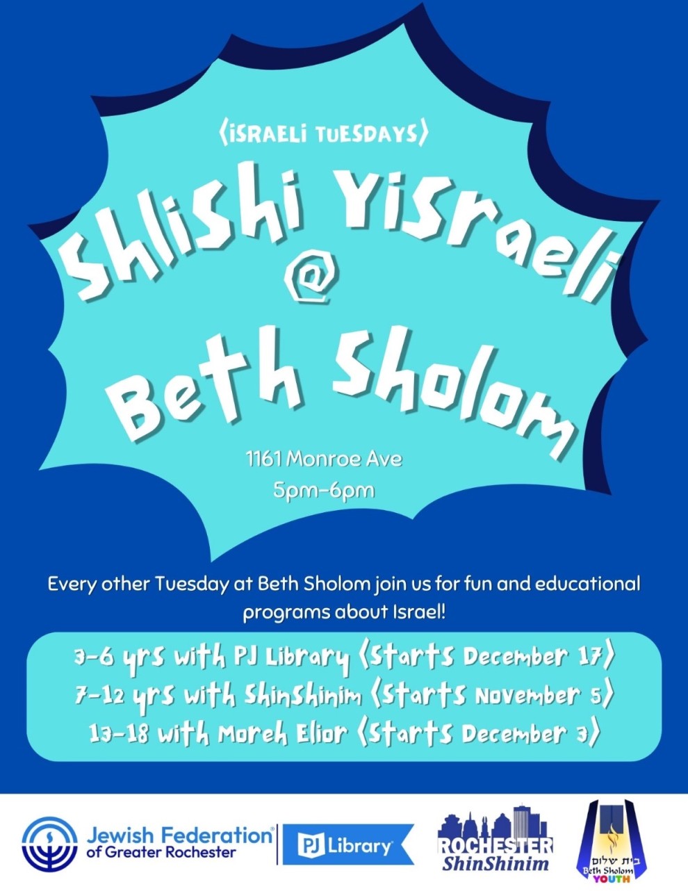 Every other Tuesday at Beth Sholom, join us for fun and educational programs about Israel. Dats include: